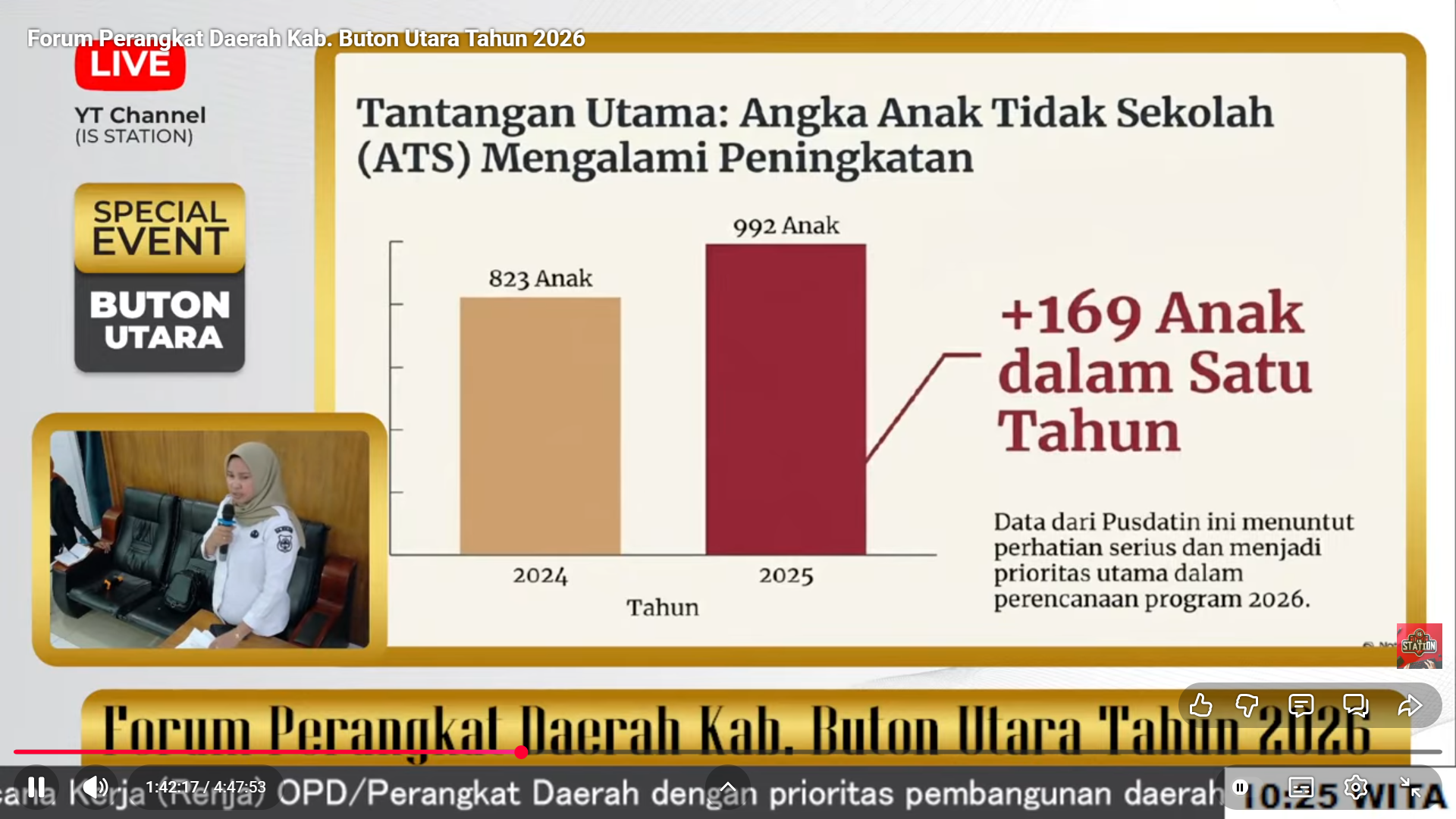 “Tantangan utama yang kami hadapi hari ini. Anak tidak sekolah mengalami peningkatan. Dari data pusdatin menunut perhatian serius dan menjadi prioritas utama dalam perencanaan program tahun 2026. Tercatat, tahun 2024 sebanyak 823 anak tidak sekolah dan kemudian tahun 2025 sebanyak 992 anak tidak sekolah. Jika dikalkulasi bertambah 169 dalam satu tahun.Ini menjadi target kami Dinas Pendidikan berkolaborasi salah satu penuntasan anak putus sekolah. Sekolah terintegrasi nanti bisa terlaksana, sebagai solusi teratasi masalah ini,” ujar Kepala Dinas Pendidikan Buton Utara, Nurtin saat memaparkan evaluasi capaian program tahun 2025 dan program strategis tahun 2026 dalam Forum Perangkat Daerah, di Aula Bappeda, 4 Maret 2026.