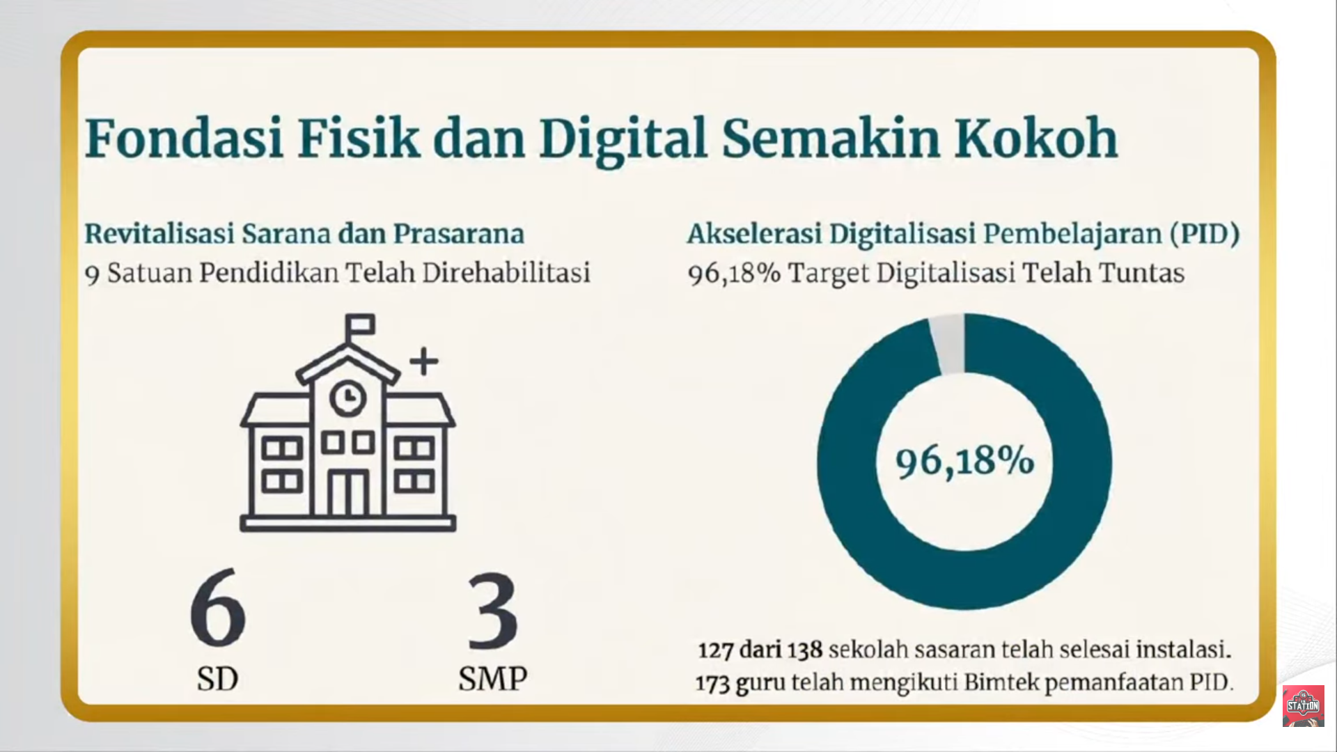 “Kondisi Fisik dan Digital semakin kokoh. Revitalisasi sarana dan prasarana 9 satuan Pendidikan telah direhabilitasi sebanyak 6 sekolah dasar dan 3 sekolah menengah pertama. Kemudian, Akselarasi digitalisasi Pembelajaran 96, 18 persen terealisasi dengan tuntas. Tercatat, dari 127 dari 138 sekolah sasaran telah terpasang instalasi dan 173 guru telah mengikuti bimbingan teknis pemanfaat aklreasi digitilasi pembelajaran,” ujar Kepala Dinas Pendidikan Buton Utara, Nurtin saat Forum Perangkat Daerah di Aula Bappeda, 4 Maret 2026.