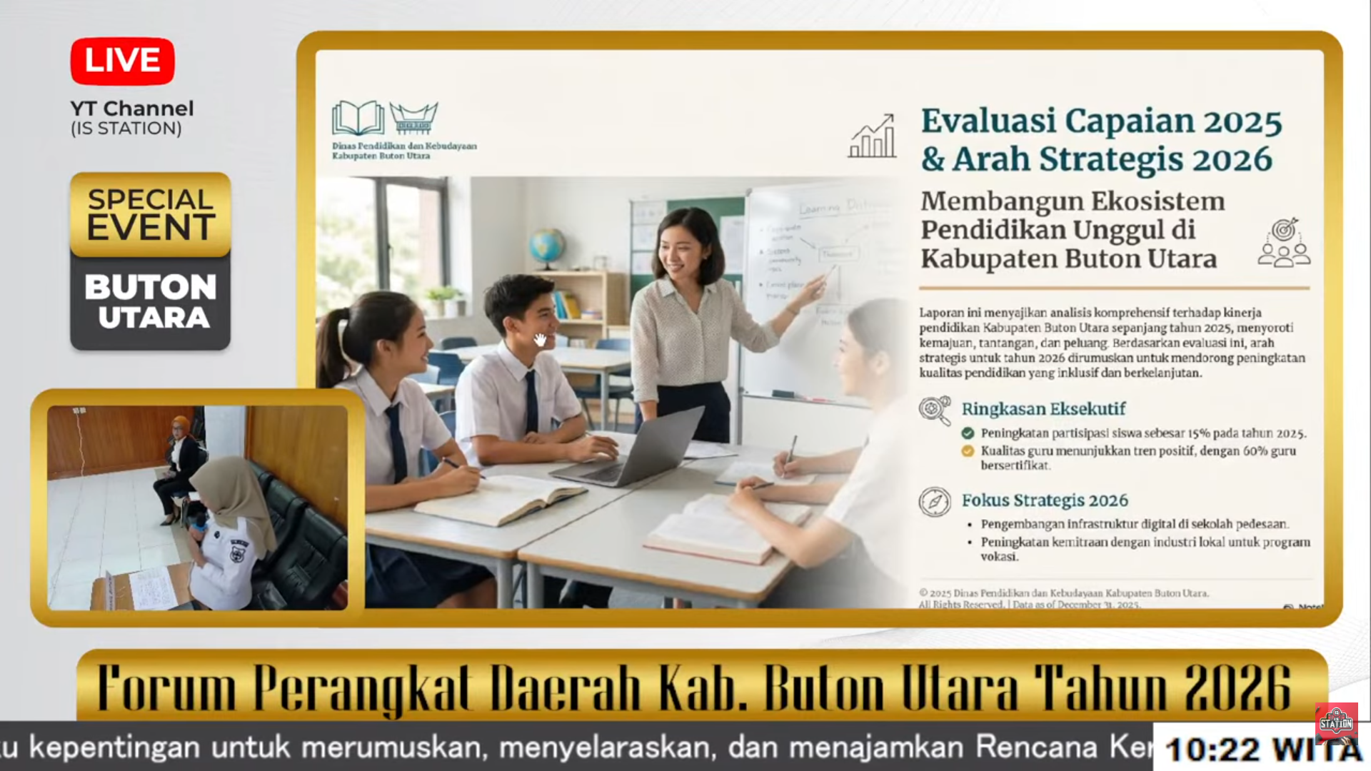 Kepala Dinas Pendidikan Buton Utara, Nurtin mengungkapkan, laporan ini menyajikan analisis komprehensif terhadap kinerja Pendidikan Buton Utara sepanjang tahun 2025 menyoroti kemajuan, tantangan, dan peluang. Berdasarkan evaluasi ini, arah strategis untuk tahun 2026 dapat dirumuskan untuk mendorong peningkatan kualitas Pendidikan yang inklusif dan berkelanjutan. Ringkasan eksekutif peningkatan partisipasi siswa 15 persen pada tahun 2025, dan kualitas guru menunjukan tren positif dengan guru 60 persen bersertifikat.