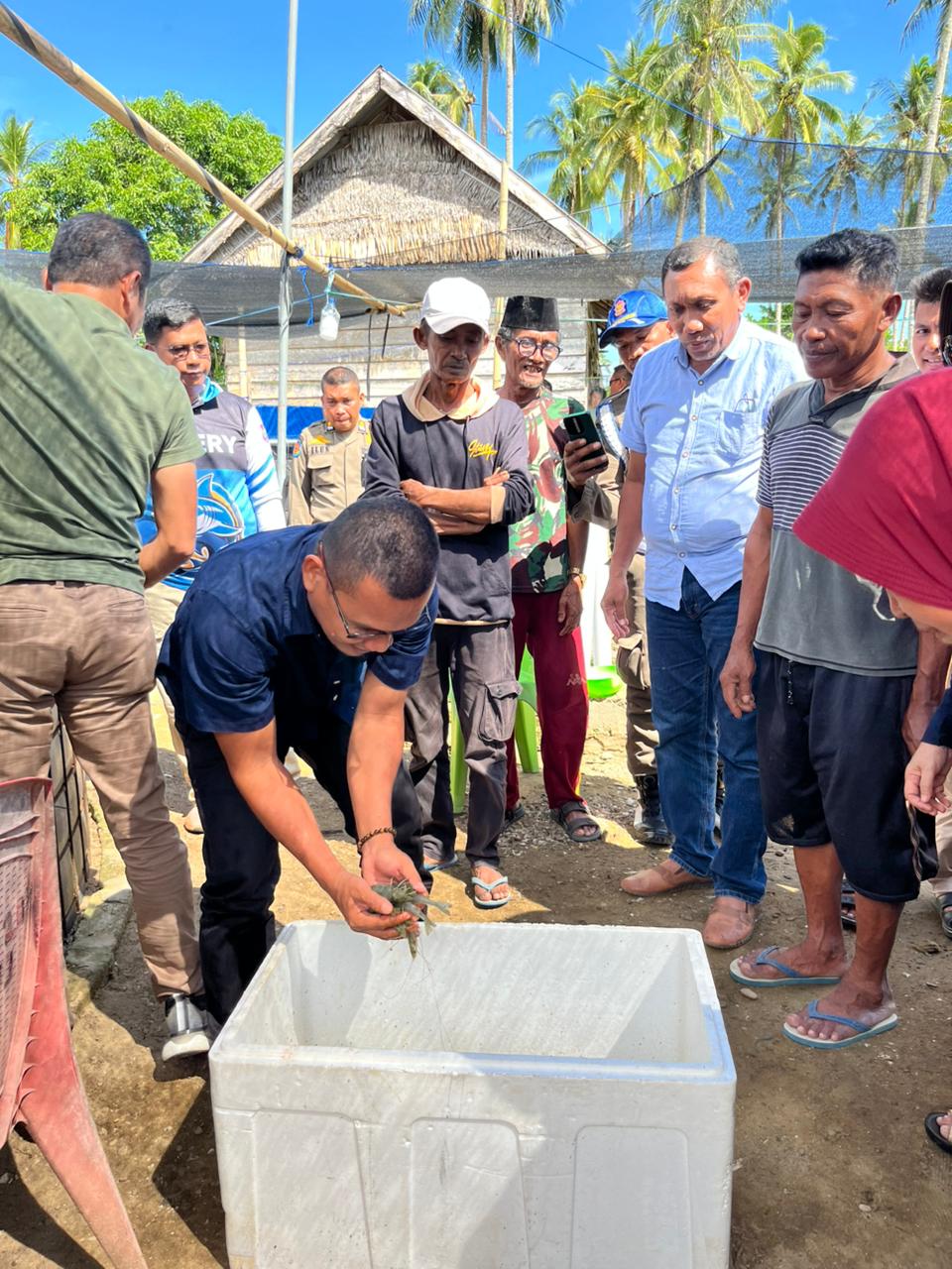 Turut hadir, Kepala Dinas Perikanan Sahrun Akri, SP., M.Si., dan Kepala BPBD Butur Made Alwi, SH., bertempat di lokasi budidaya udang yang dikelola oleh Bumdes Jaya Mandiri Wowonga Jaya.